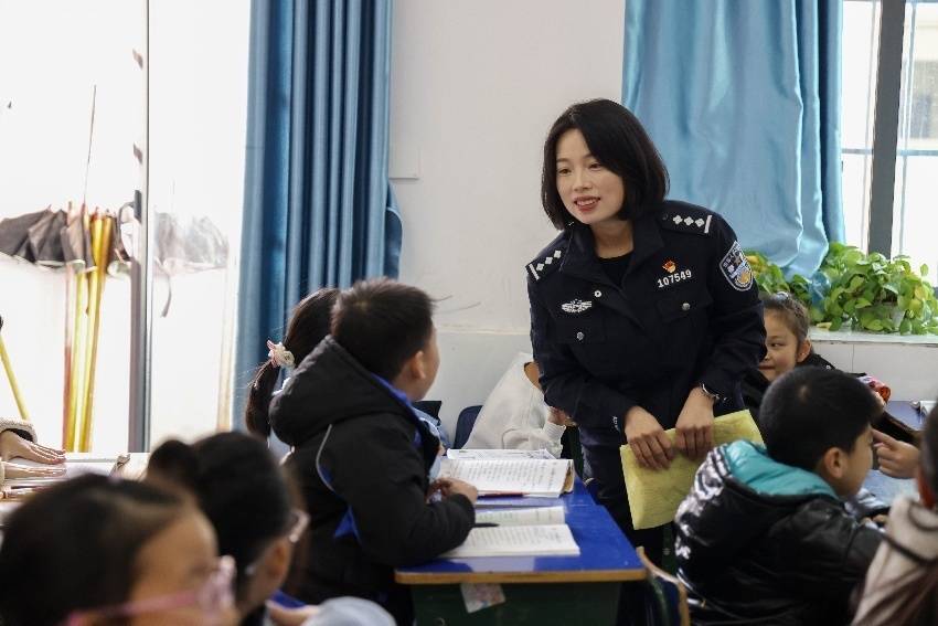 唐娟在学校给孩子们宣讲网络安全。岳池县公安局供图