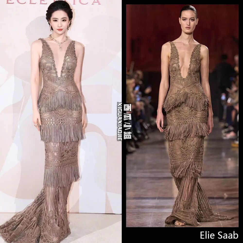 Elie Saab的礼服上刺绣极尽奢华,既包裹出柔美的曲线,又充满高贵的力量感。她白皙的皮肤,盘起的黑发,带着古典东方美人的韵味,远远看过去,像是一尊金镶玉观音,典雅庄重,细腻完美,叫人信服。