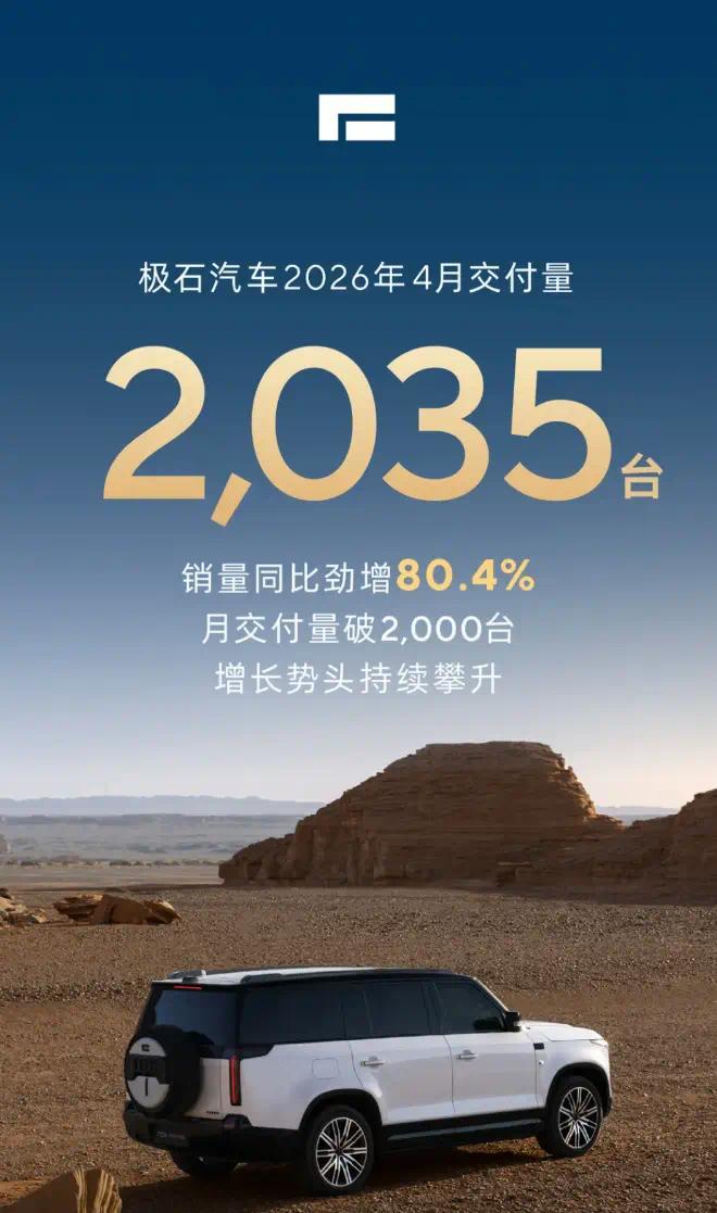 IT之家 4 月 30 日消息,和往常一样,极石汽车今日率先公布了 2026 年 4 月成绩单 —— 共计交付 2035 台新车,销量同比劲增 80.4%,月交付量破 2000 台。